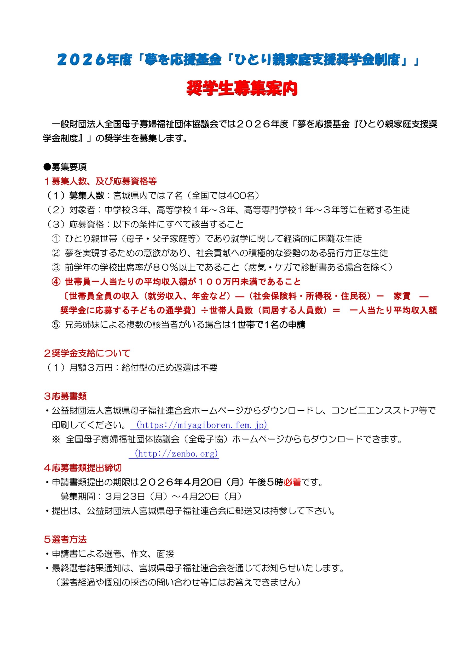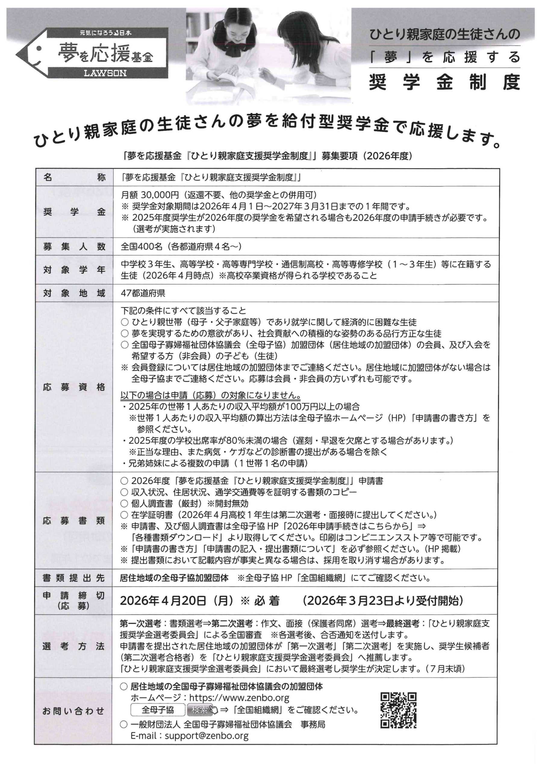 「夢を応援基金『ひとり親家庭支援奨学金制度』」奨学生の募集を行います。