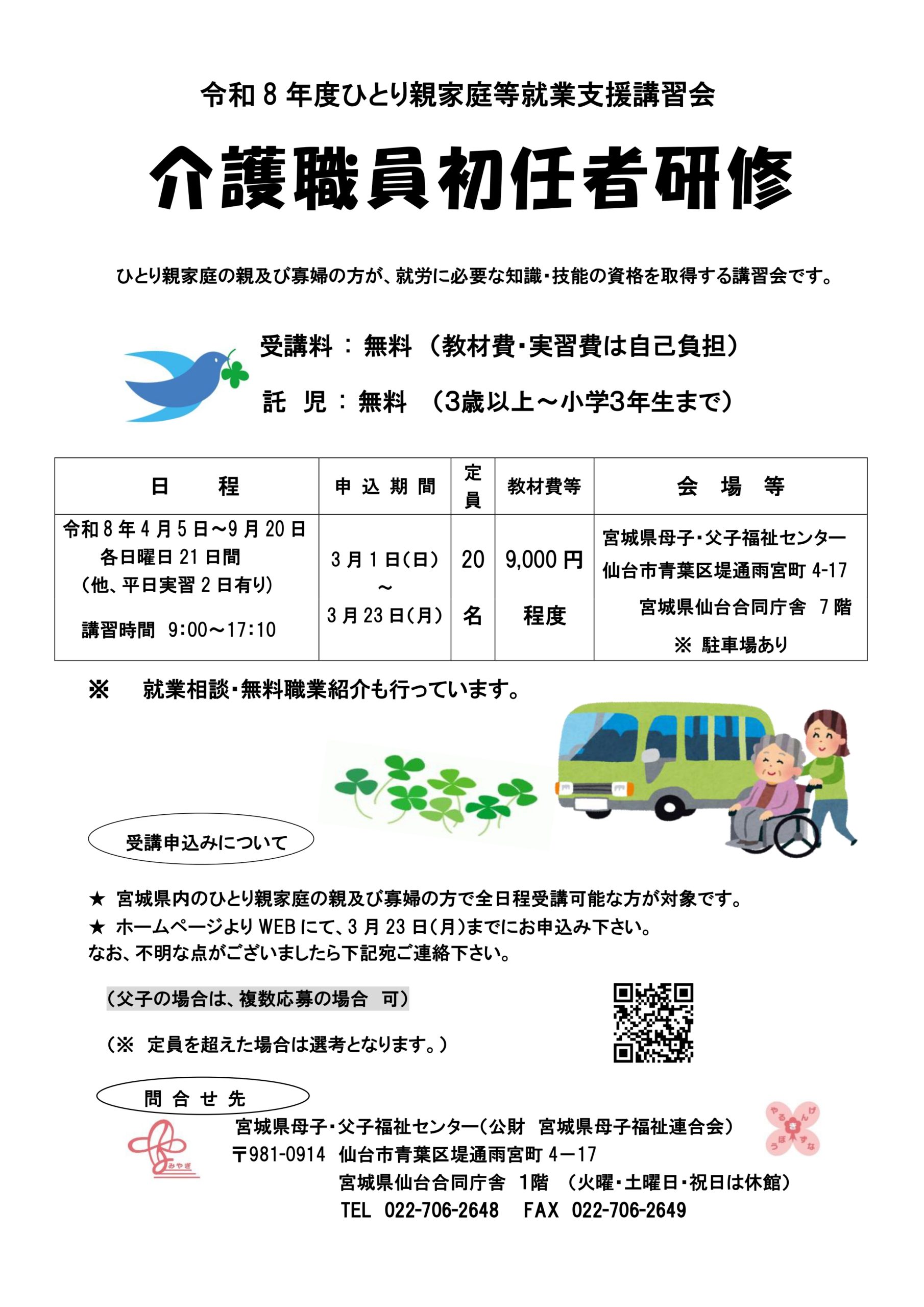 令和7年度ひとり親家庭等就業支援講習会「介護職員初任者研修」を実施します。